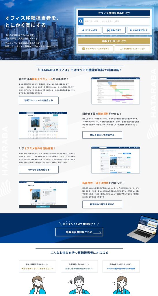 東京・大阪を始め全国展開し、オフィス移転のパートナーとして、B to Bで物件提案・契約・サポートなどを一貫して提供している 株式会社HATARABA 様において、移転用オフィス検索型Webプラットフォームの新規立ち上げプロジェクトがあり、リニューアルUIデザインに関する IA設計・UIデザインの提案とデザインデータ作成、仕上がったデザインのフロント側実装を主に担当致しました。